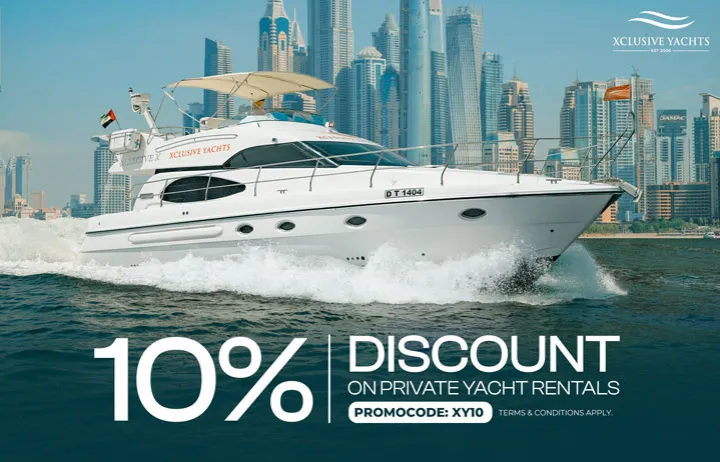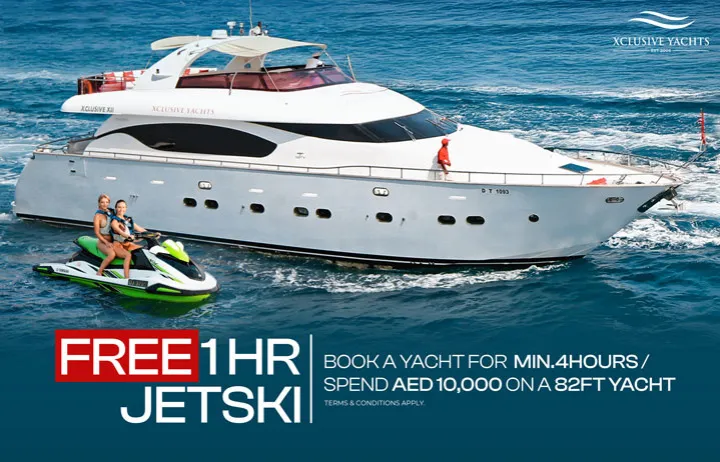 - Book a minimum 4-hour yacht charter or spend a minimum of AED 10,000 on an 82 ft+ yacht and receive a free 1-hour jetski session