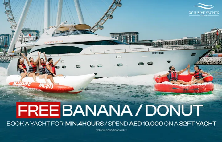 - Book a minimum 4-hour yacht charter or spend a minimum of AED 10,000 on an 82 ft+ yacht and enjoy a free banana boat or donut ride