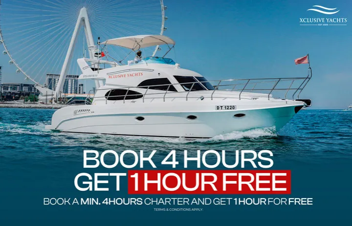 - Book a minimum 4-hour yacht charter and get 1 additional hour for free