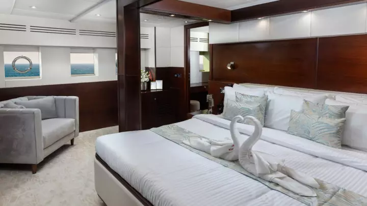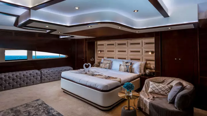 Enjoy the grandeur of a 141ft tri-deck yacht with expansive lounges, panoramic views, and the highest standards of comfort.-