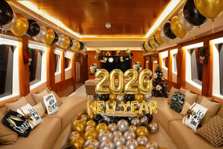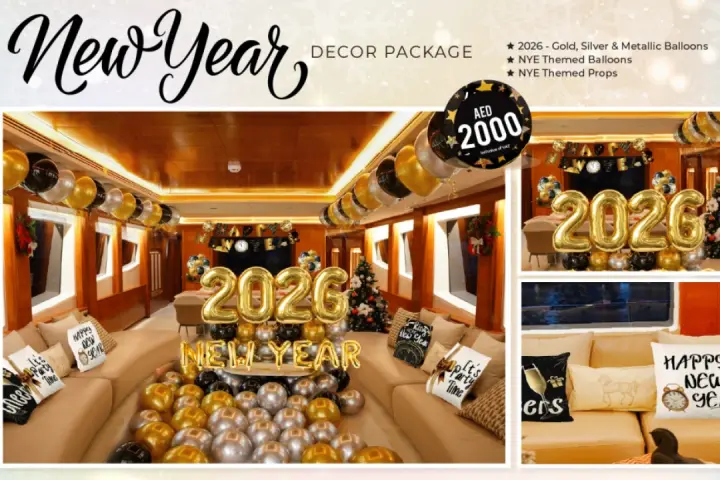 A New Year’s Eve celebration is all about atmosphere, and decor plays a starring role. Our specially curated New Year’s Eve decor packages bring elegance, warmth, and festive energy onboard. Think shimmering gold, silver, and metallic balloons, stylish cushions with celebratory messages, themed props, and a glamorous setup that instantly elevates the entire yacht.