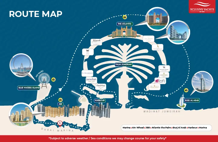 Please make your way to our lounge at retail Unit 3, Marina Level, Al Majara Tower, Al Hubob Street, Dubai Marina. Our team will meet you there and escort you to the vessel.