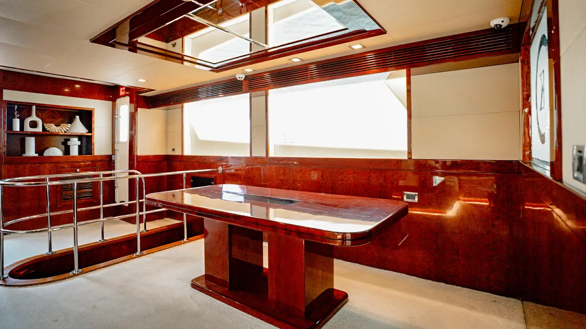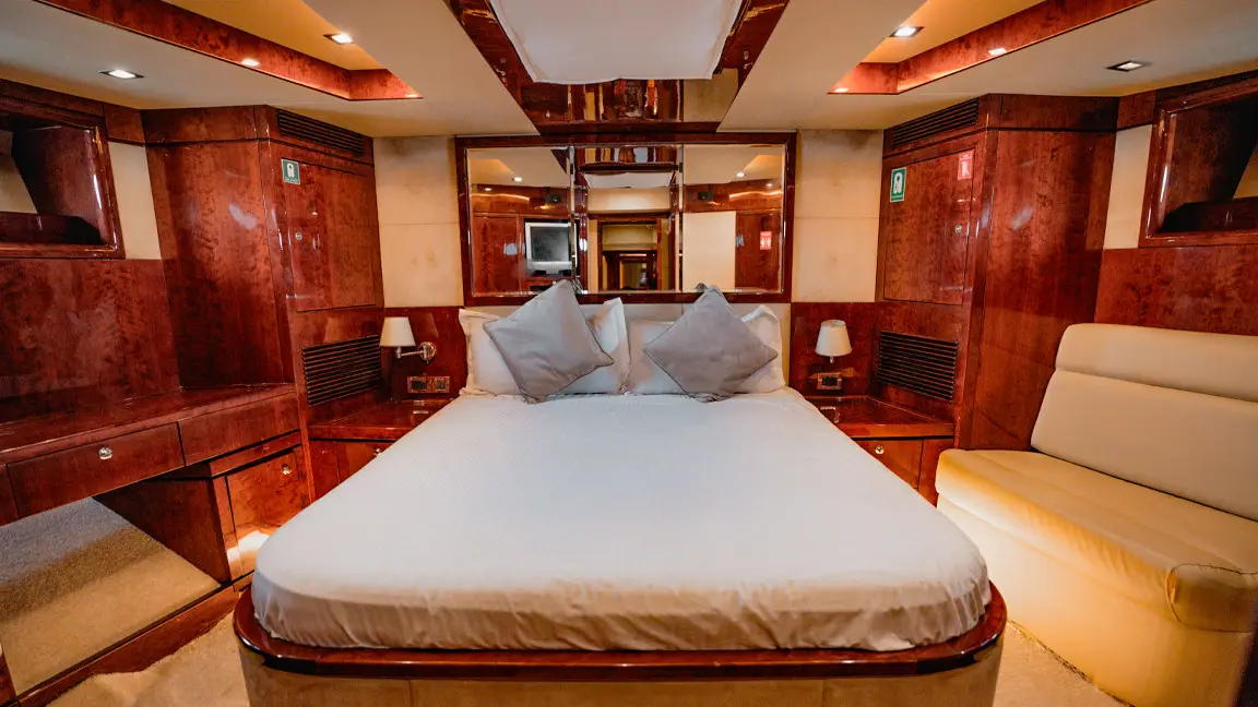 The salon provides ample space for rest and relaxation and with its large windows captures glorious views of the Gulf. The yacht is fully equipped for entertaining with a full surround sound system, making it perfect for a celebration.