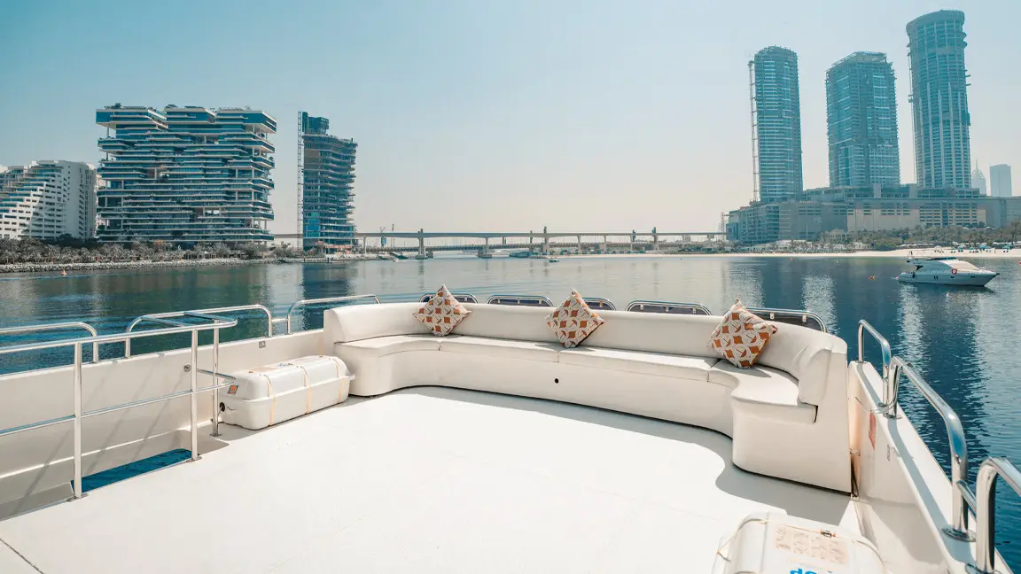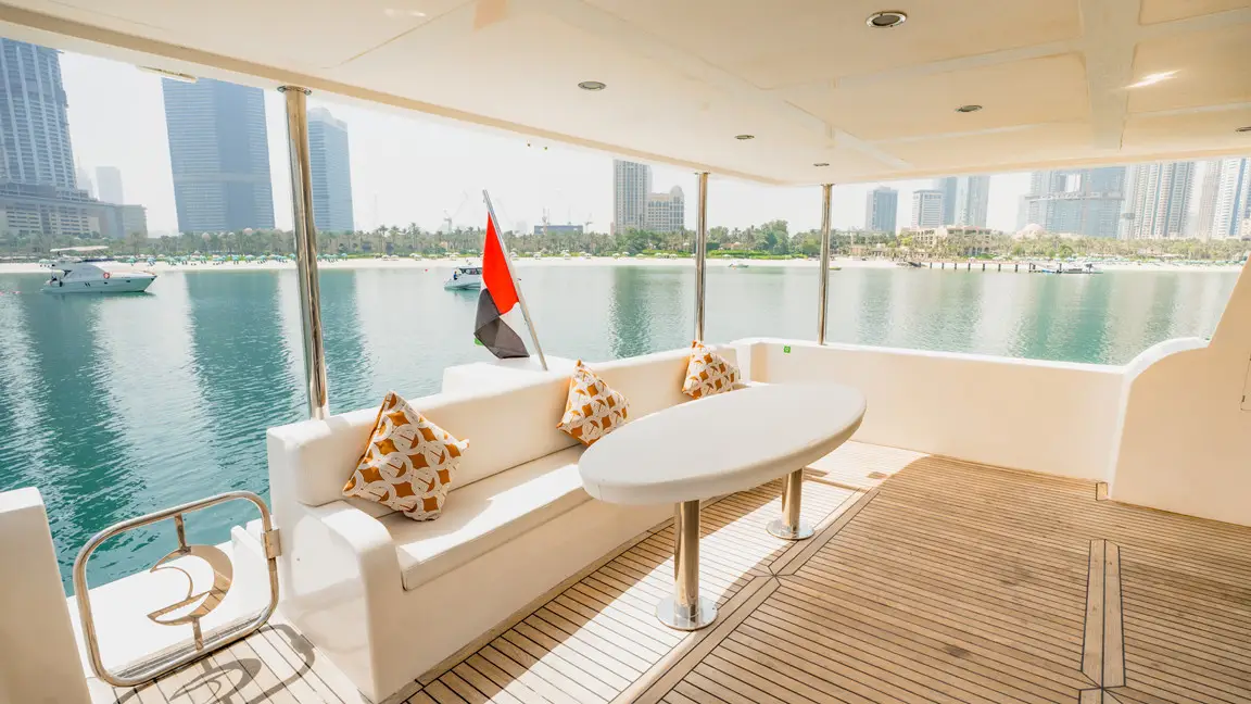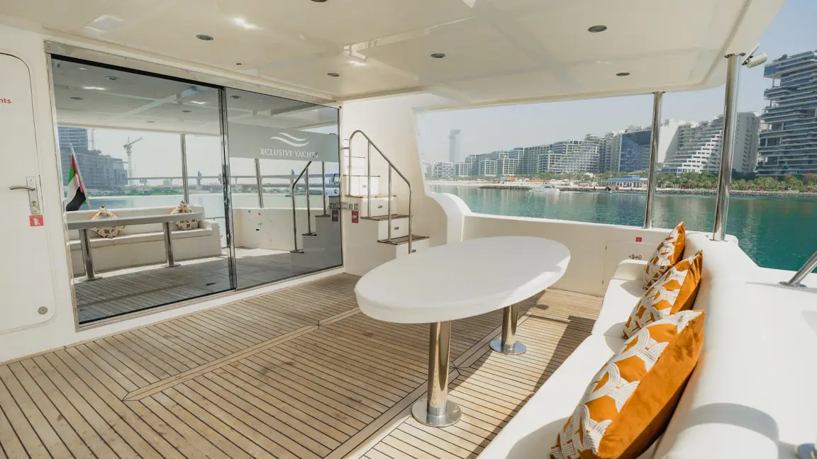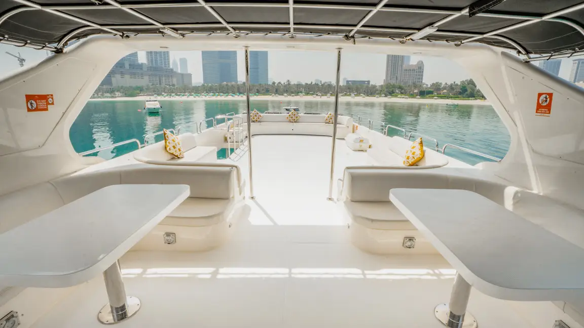 The flybridge has comfortable seating area, where you and your guests have plenty of room to relax, or dance if you’re having a party.