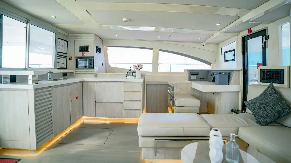 The 65ft luxury catamaran is beautifully outfitted to provide the highest level of comfort while cruising, making it ideal for a family / friends cruise experience. It brings with it a multitude of exciting features, including a sleek design, a large forward cockpit, additional lounging areas, an expansive flybridge and a completely redesigned interior upgraded with modern appliances.