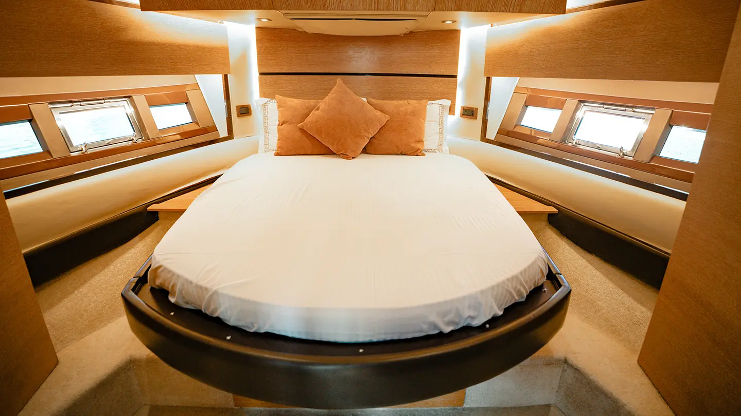 For those aspiring to have some fun in the sun, Azimut 50 has a large bathing platform as well as a fly bridge. She has a range of luxurious and comfortable features including the up and down bathing platform at the stern that acts like a private beach. In the main salon, the uniquely designed C-shaped sofa can be extended to form a double bed with storage lockers hidden beneath it.